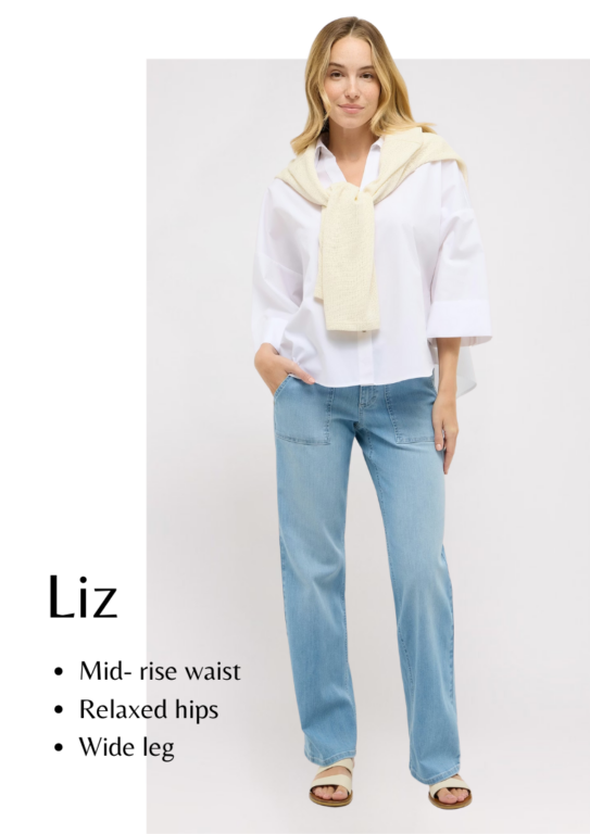 De Liz is het wijdste model uit de Angels collectie. Deze wide leg jeans loopt al vanaf de heup losjes uit en heeft een vlotte, eigentijdse uitstraling. Wijd mag weer, en de Liz bewijst dat een wijde jeans juist heel vrouwelijk kan zijn. Met sneakers oogt hij stoer, met een hak creëer je lengte en oogt de broek elegant.
