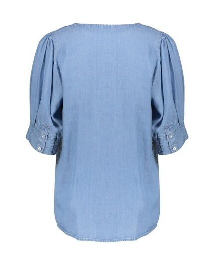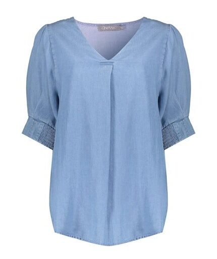 Top lyocell denim V-hals en korte mouw. Merk Geisha in kleur 000827 mid blue artikel Nikita. 100% lyocell