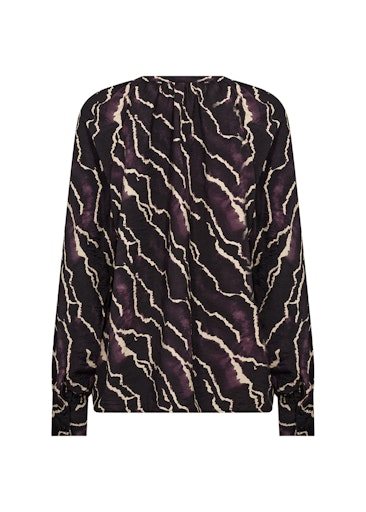 De SC-ANYA 2 blouse is gemaakt van 85% LENZING™ ECOVERO™ viscose en 15% nylon. Het heeft een opvallende abstracte print, een knoopsluiting aan de voorkant en een klassieke kraag met lange mouwen. Dit elegante overhemd is goed te combineren met een pantalon of rok voor een stijlvolle look. Merk Soyaconcept in de kleur 5120 plum.