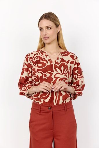 De SC-ANYA 2 blouse is gemaakt van 85% LENZING™ ECOVERO™ viscose en 15% nylon. Het heeft een opvallende abstracte print, een knoopsluiting aan de voorkant en een klassieke kraag met lange mouwen. Dit elegante overhemd is goed te combineren met een pantalon of rok voor een stijlvolle look. Merk Soyaconcept in de kleur 41484 toffee.