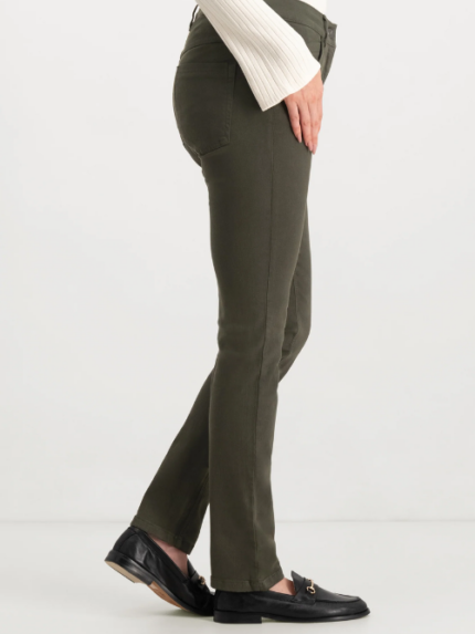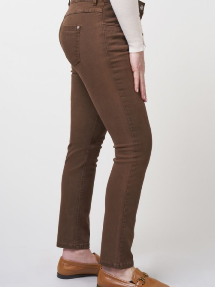 De cora is een 5-pocket model in een recht formaat. De broek sluit dus niet volledig aan en is ideaal voor vrouwen met een iets steviger bovenbeen.er zit ruimte bij de knieën en loopt vanaf daar heel subtiel smaller naar onderen.