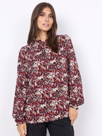 SC-Tarita 1 is een kleurrijke blouse gemaakt van 100% viscose. Deze mooie blouse heeft een hoge halslijn met ruches, een knoopsluiting, lange mouwen met ruches aan de manchetten en een leuke print. Combineer hem met een linnen broek en enkele loafers voor een leuke look.