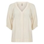 Deze blouse is gemaakt van 65% LENZING™ ECOVERO™ viscose en 35% gerecycled polyester. Deze elegante blouse heeft verfijnde details langs de V-hals en mouwen en een comfortabele, losse pasvorm. Combineer hem met een nette pantalon voor een sophisticated look of met een jeans voor een meer casual stijl. Merk Soya in de kleur 1620 cream, artikel 41621