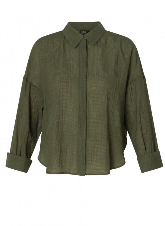 Een blouse met een relaxte uitstraling. Dit model is uitgevoerd in een luchtige viscose-polyamide kwaliteit die comfortabel draagt. De structuurstof geeft net wat extra diepte, terwijl de loose fit zorgt voor bewegingsvrijheid. Ideaal om te combineren met een jeans of rok, voor een easy-going look. Art. Coralie 0005800 kleur 140154 army green merk Yest.