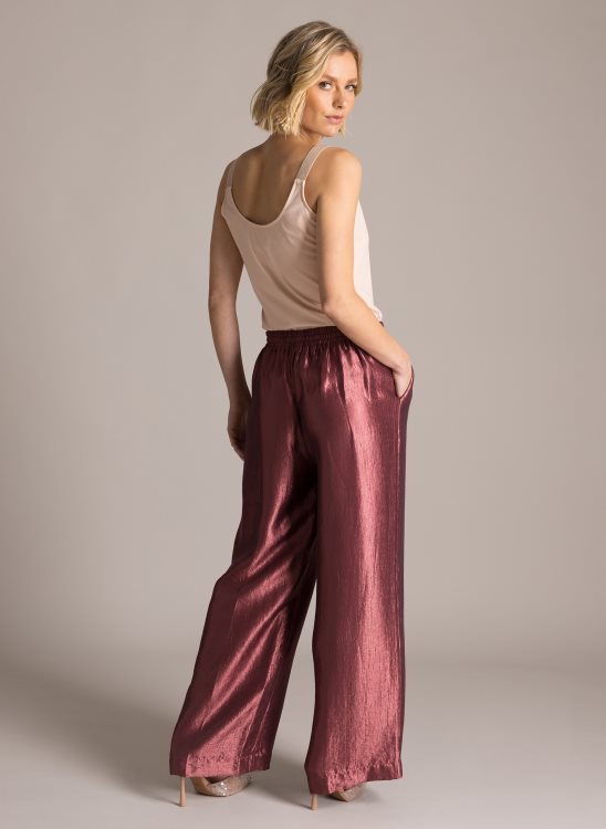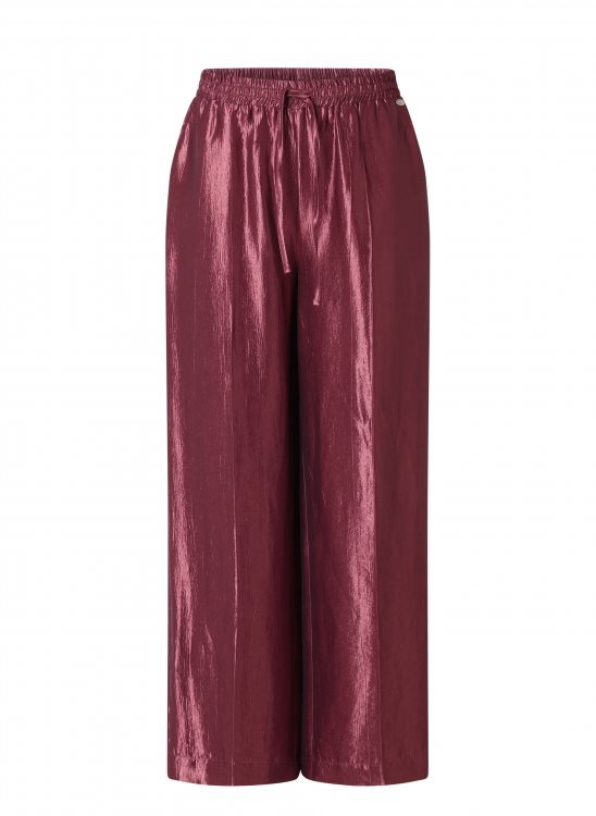 Deze glanzende pantalon geeft elke outfit direct wat extra flair. Hij zit heerlijk dankzij de elastische taille en valt luchtig recht naar beneden. De voorbeennaad zorgt voor een mooie shape, terwijl de steekzakken het lekker praktisch houden. Combineer ’m met het bijpassende jasje voor een opvallend stijlvolle set. Merk Yest kleur 8930 plum artikel 0006359 klara. Samenstelling