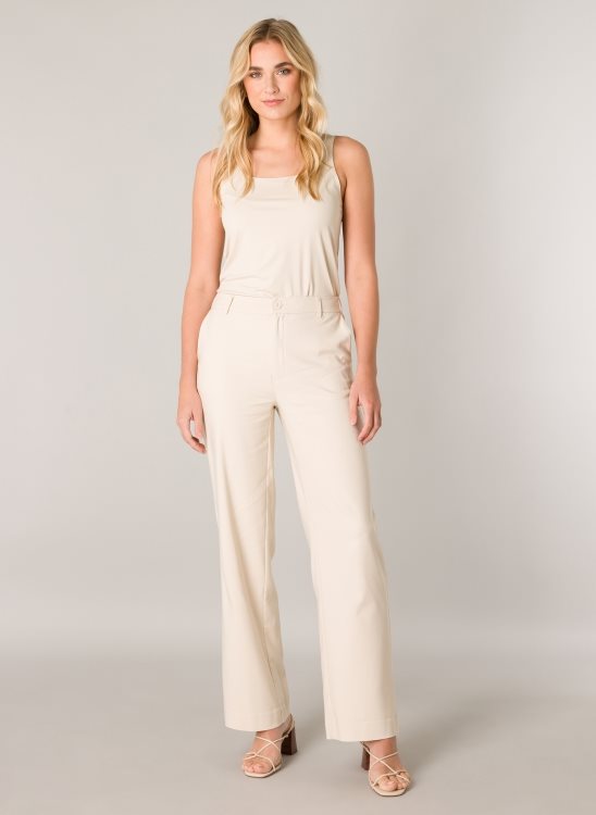 Yorin van Baselevel is een wijde broek van een viscose/nylon mix met een knoopsluiting en gesloten paspelzakken aan de achterkant. Het heeft ook elastiek in de tailleband aan de achterkant voor een comfortabele pasvorm.