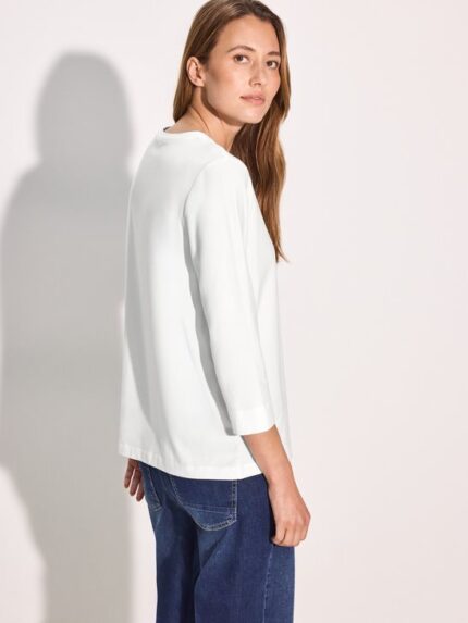 Broek van travelstof met zakjes en elastische tailleband met koordjes.