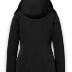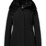 Zwarte winterjas met nep bontkraag en capuchon.