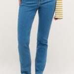 Deze spijkerbroek is niet ge-used en dus effen van kleur zonder gebleekte bovenbenen.