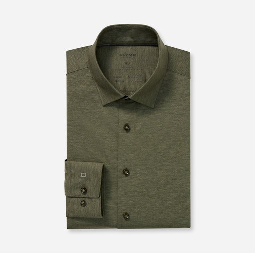 Altijd in persoonlijke topvorm: deze innovatieve OLYMP Luxor 24/Seven combineert het comfort van een T-shirt met de scherpe uitstraling van een businessoverhemd. De gladde textuur van de Dynamic Flex-jersey is ademend, sneldrogend, rekbaar en gemakkelijk te strijken. Met een nette new-kentkraag en sportieve pasvorm. Overhemd in kleur 45 groen model 120264 . 92% katoen, 8% Elastaan