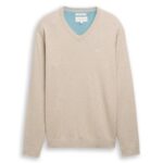 Basic trui in effen kleuren met ton-sur-ton geborduurd logo op de borst. Met geribde boorden aan de zoom. Merk Tom Tailor, in kleur 38310 beige art. 1039811 . 100% katoen