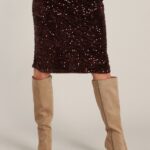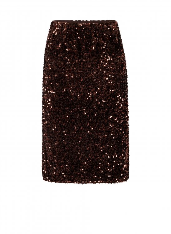 Een feestelijke rok met pailletten allover. De stretchkwaliteit zorgt voor een aansluitende pasvorm die prettig draagt. De binnenkant is afgewerkt met een zachte jersey voering, waardoor de rok comfortabel aanvoelt. Uitgevoerd in een bruine tint die schittert bij iedere beweging. Perfect voor de feestdagen.