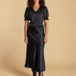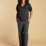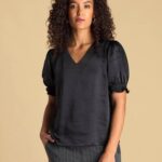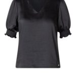 Satijnlook blouse met korte- pofmouwtjes en een v-hals. De blouse heeft een prachtige glans in de stof.