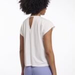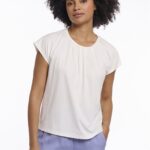 Omarm ingetogen elegantie met deze verfijnde top, ontworpen met licht gebogen, verlengde mouwen en een strakke ronde halslijn, geaccentueerd door subtiele plooien aan de voorkant. Art. Ladonna in de kleur snow white, van het merk Rino&Pelle.