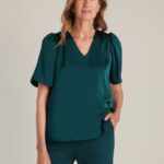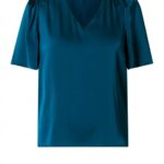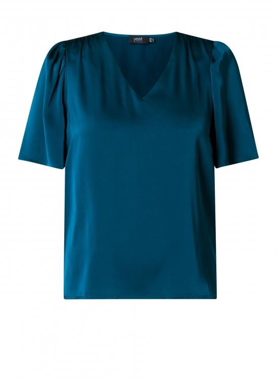 Een blouse die soepel valt en een subtiele glans heeft dankzij het gerecyclede polyester. De V-hals en de plooitjes op de schouders geven het ontwerp een verfijnd detail. Met korte mouwen en een rechte fit blijft de uitstraling tijdloos. Art. Pippa 0005885 kleur 3090 teal green merk Yest.