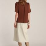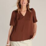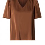 Een blouse die soepel valt en een subtiele glans heeft dankzij het gerecyclede polyester. De V-hals en de plooitjes op de schouders geven het ontwerp een verfijnd detail. Met korte mouwen en een rechte fit blijft de uitstraling tijdloos. Art. Pippa 0005885 kleur 9030 brown merk Yest.