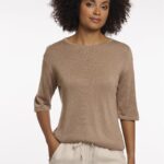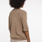 Een lichtgewicht gebreide top met een subtiele glans die het licht op een ingetogen manier weerkaatst.