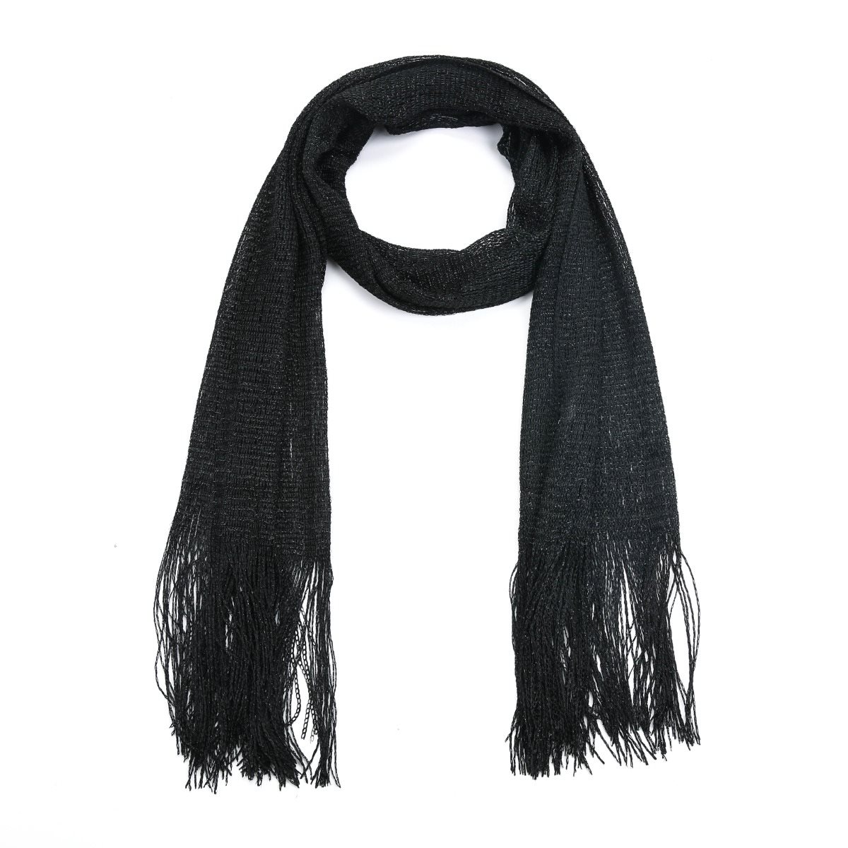 Maak je outfit compleet door deze ‘shiny’ zwarte sjaal toe te voegen.