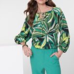 Blousetop ronde hals met koordsluiting print dessign. Merk Geisha in kleur 000718 ecru/green artikel 63239-20 . 100% Viscose