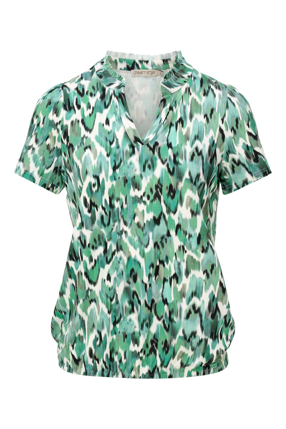 Shirt KM met V-hals print blurry merk Dreamstar in de kleur jade mix. Artikel Jetta. 95% viscose-5% elastan